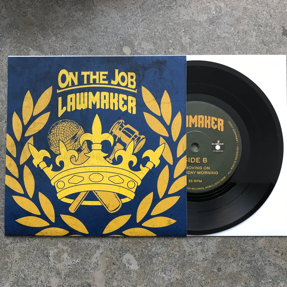Swedish-American outfit Lawmaker split 7” with Swedish legends On the Job from 2023. Black vinyl. (Galgbacken Records – GP004)